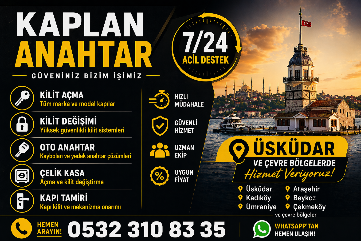 Kaplan Anahtar & Çilingir, İstanbul Üsküdar ve Kadıköy başta olmak üzere çevre bölgelerde 7/24 profesyonel çilingir hizmeti sunmaktadır. Kapı açma, oto çilingir, kilit değişimi, çelik kapı kilit servisi, anahtar kopyalama ve kasa açma gibi birçok alanda hızlı ve güvenilir çözümler sağlamaktayız.